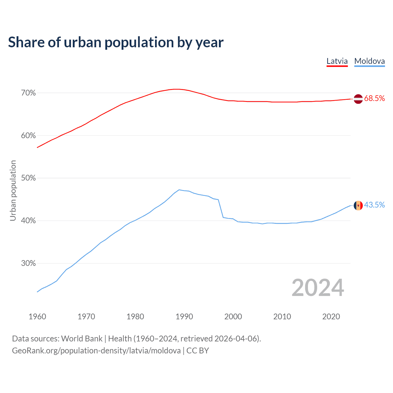 From 2004 to 2024, the share of urban population changed from 67.9% to 68.5% in Latvia and from 39.4% to 43.5% in Moldova.