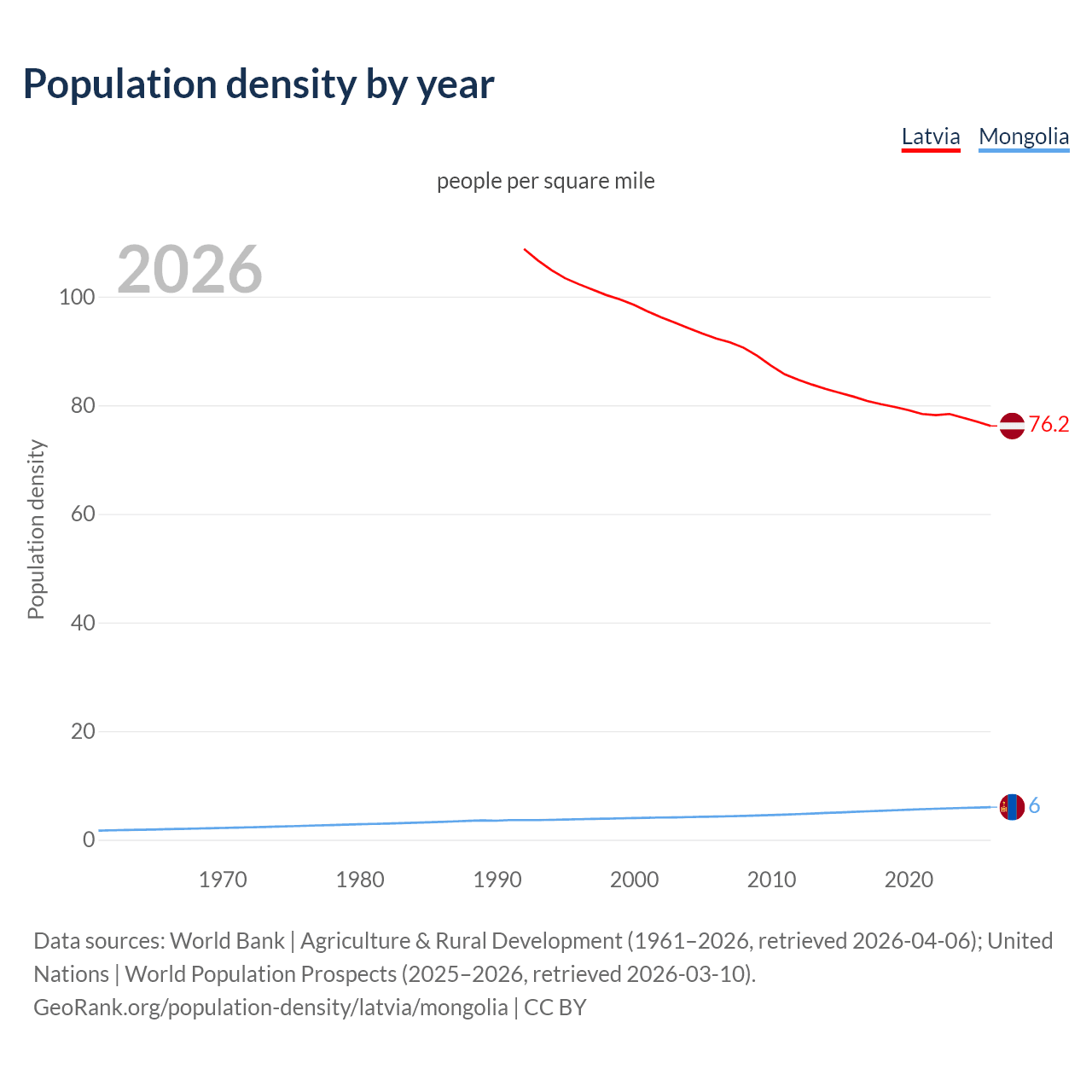 From 2006 to 2026, population density in Latvia decreased by 17.5%, compared to a 40.5% growth in Mongolia.