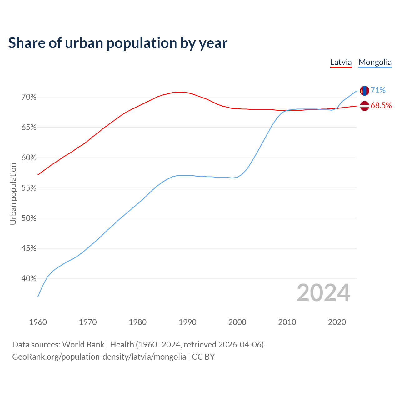 From 2004 to 2024, the share of urban population changed from 67.9% to 68.5% in Latvia and from 60.8% to 71% in Mongolia.