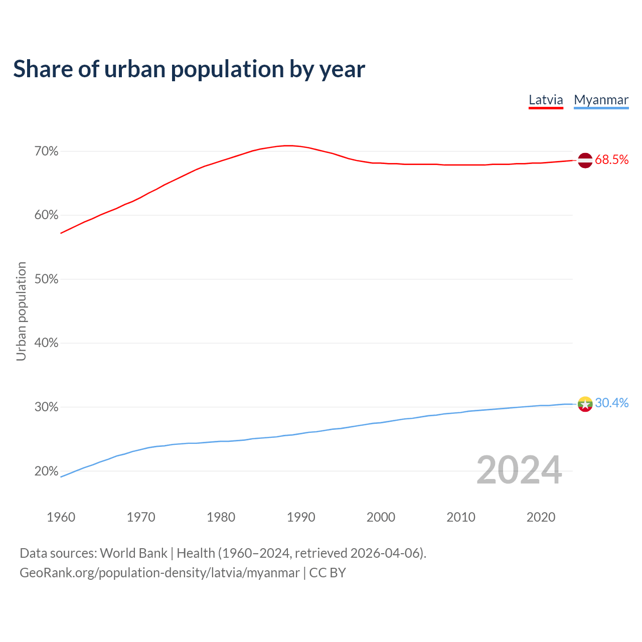 From 2004 to 2024, the share of urban population changed from 67.9% to 68.5% in Latvia and from 28.2% to 30.4% in Myanmar.