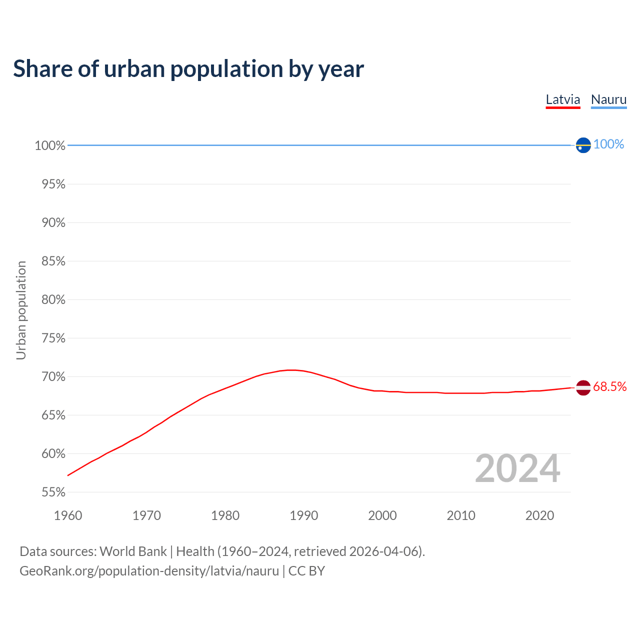 From 2004 to 2024, the share of urban population changed from 67.9% to 68.5% in Latvia and from 100% to 100% in Nauru.