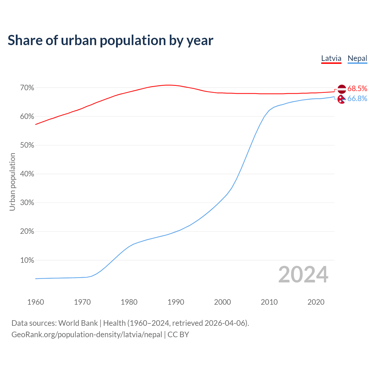 From 2004 to 2024, the share of urban population changed from 67.9% to 68.5% in Latvia and from 41.6% to 66.8% in Nepal.