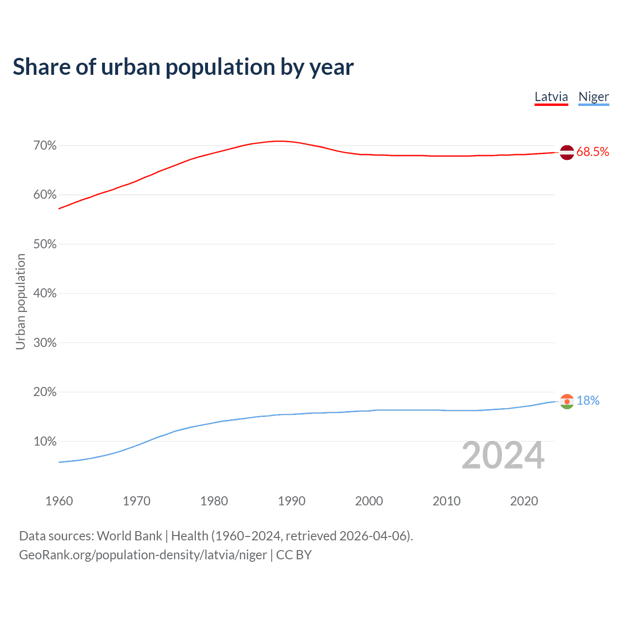 From 2004 to 2024, the share of urban population changed from 67.9% to 68.5% in Latvia and from 16.3% to 18% in Niger.