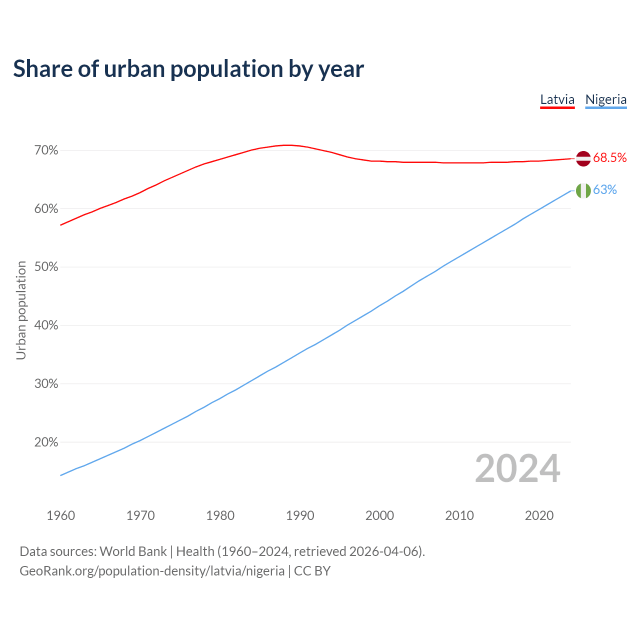 From 2004 to 2024, the share of urban population changed from 67.9% to 68.5% in Latvia and from 46.7% to 63% in Nigeria.