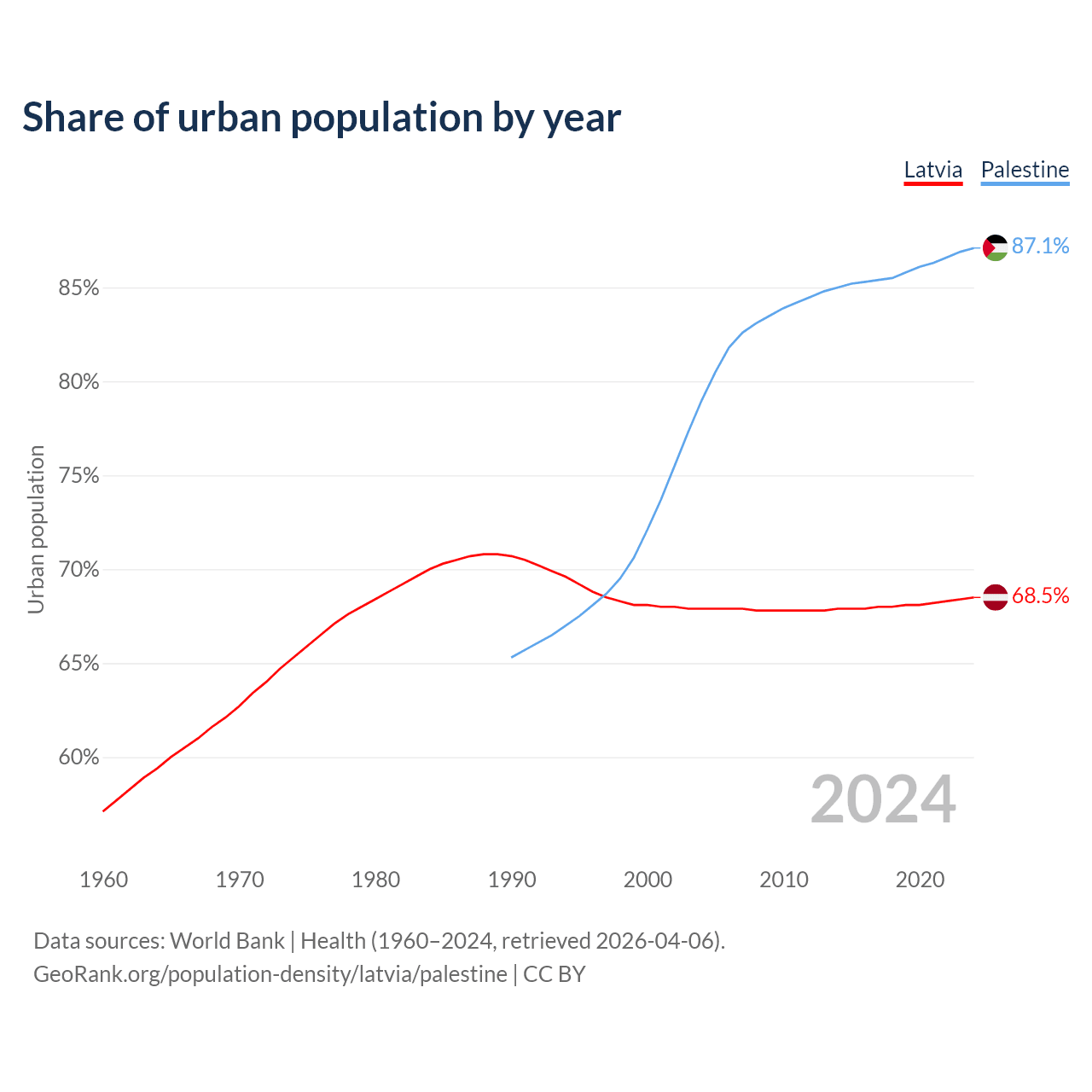From 2004 to 2024, the share of urban population changed from 67.9% to 68.5% in Latvia and from 79% to 87.1% in Palestine.