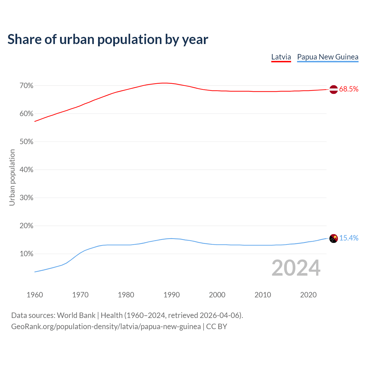 From 2004 to 2024, the share of urban population changed from 67.9% to 68.5% in Latvia and from 13.1% to 15.4% in Papua New Guinea.