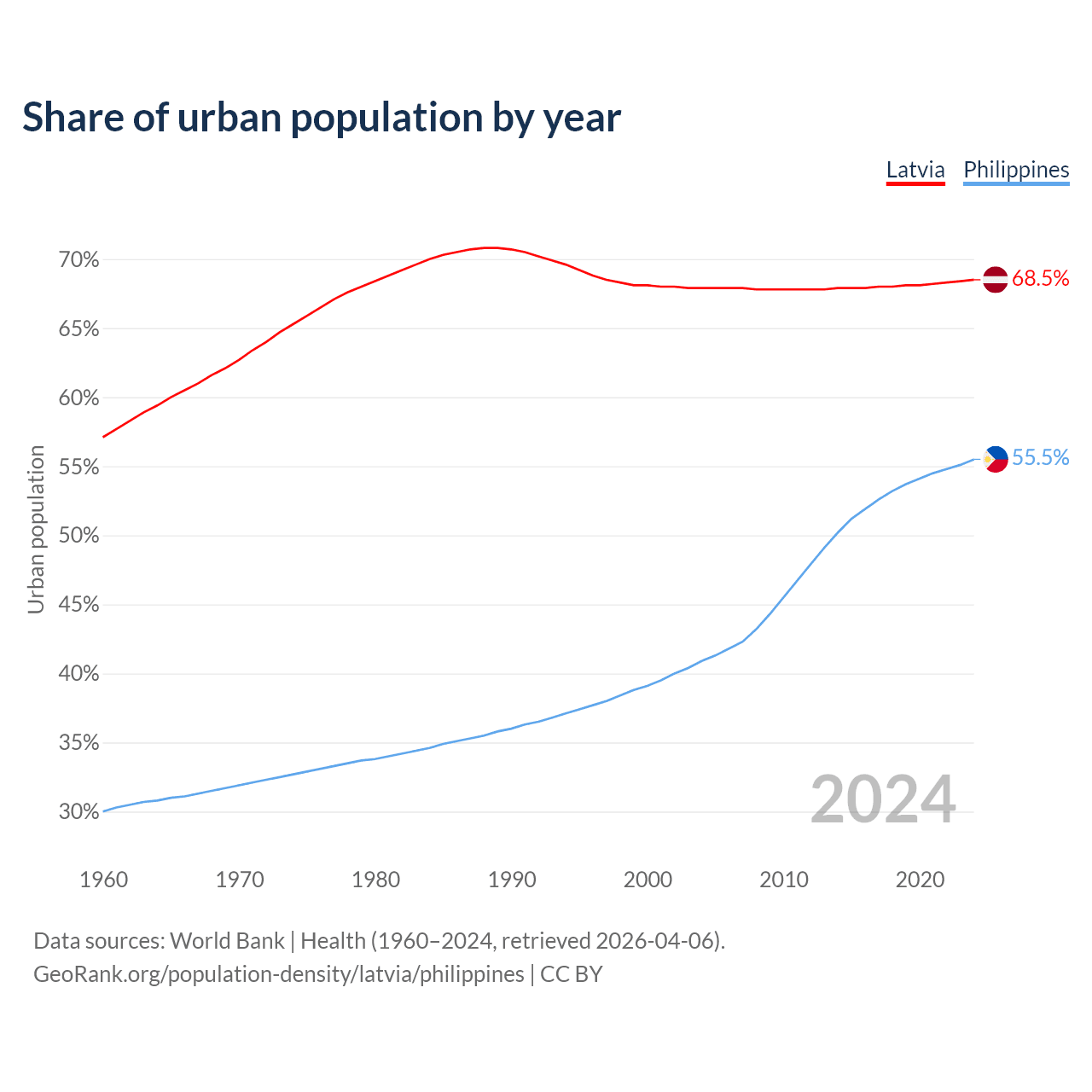 From 2004 to 2024, the share of urban population changed from 67.9% to 68.5% in Latvia and from 40.9% to 55.5% in the Philippines.