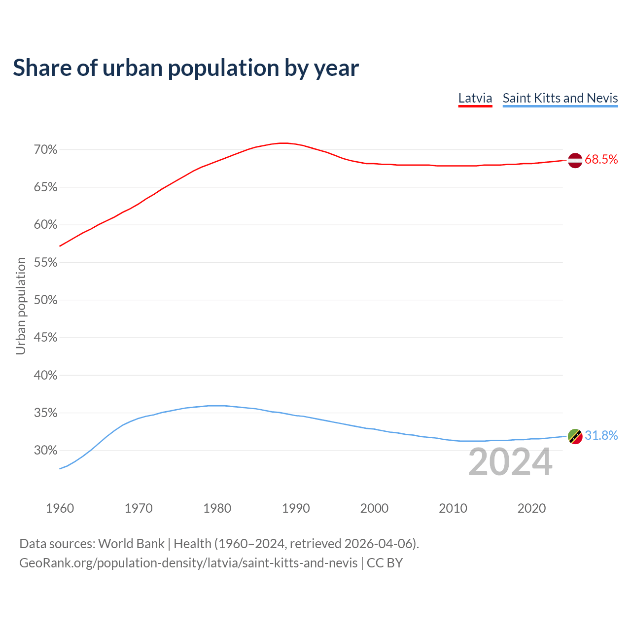 From 2004 to 2024, the share of urban population changed from 67.9% to 68.5% in Latvia and from 32.1% to 31.8% in Saint Kitts and Nevis.