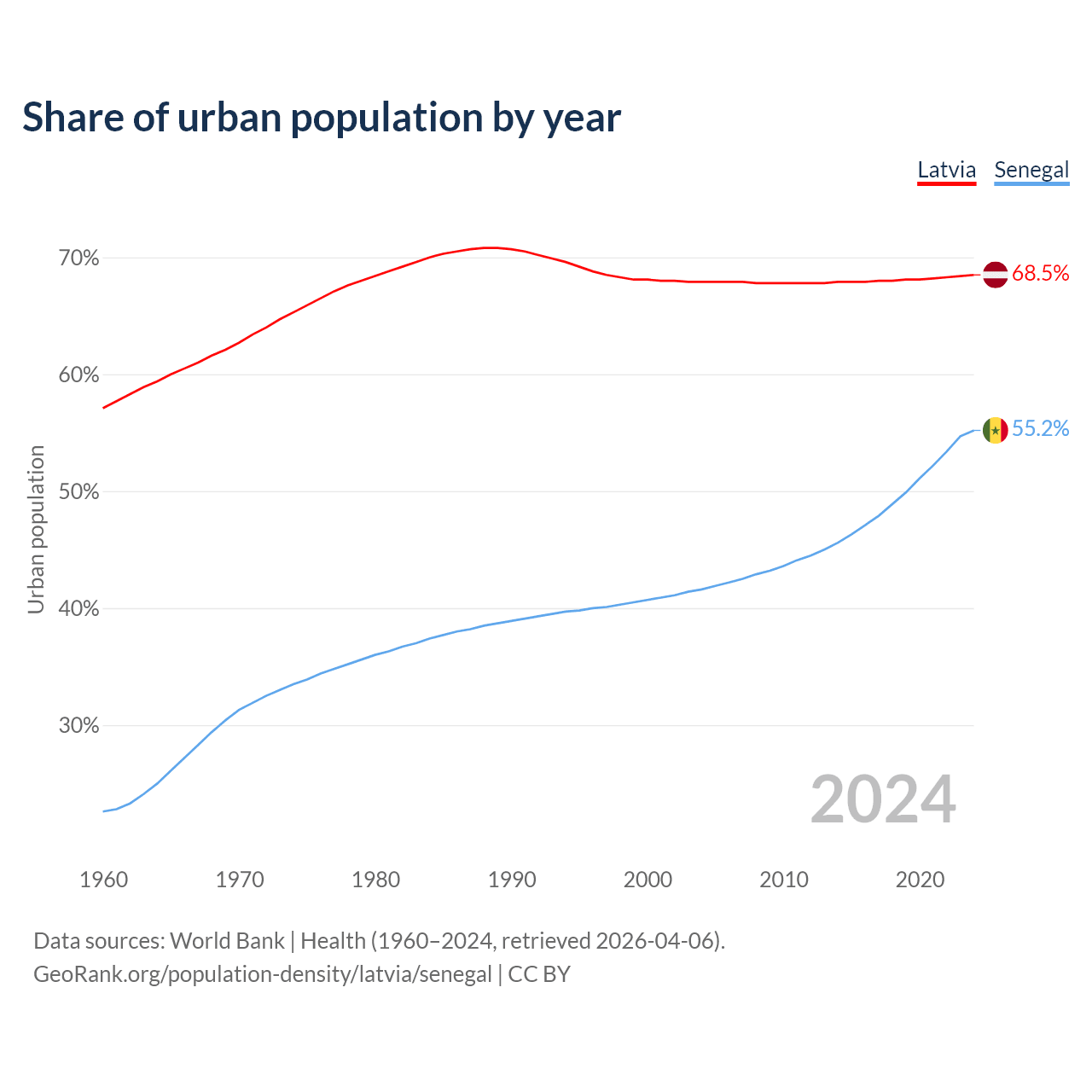 From 2004 to 2024, the share of urban population changed from 67.9% to 68.5% in Latvia and from 41.6% to 55.2% in Senegal.