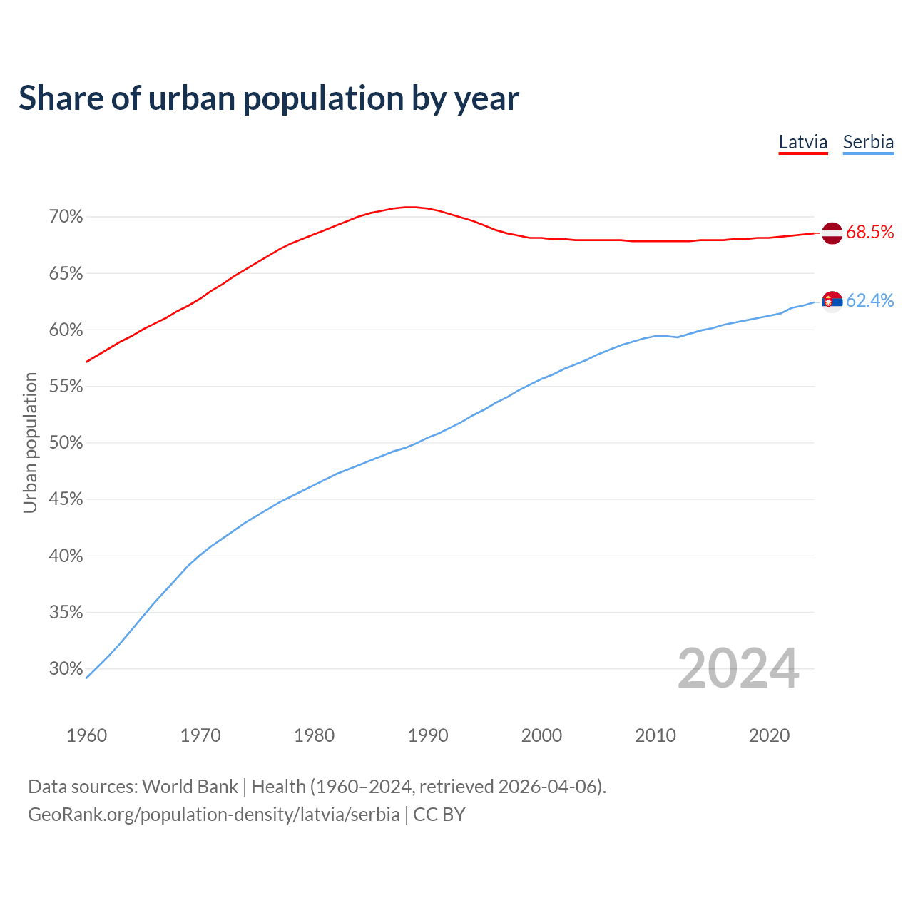 From 2004 to 2024, the share of urban population changed from 67.9% to 68.5% in Latvia and from 57.3% to 62.4% in Serbia.