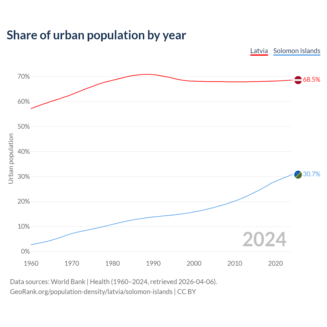 From 2004 to 2024, the share of urban population changed from 67.9% to 68.5% in Latvia and from 17.2% to 30.7% in the Solomon Islands.