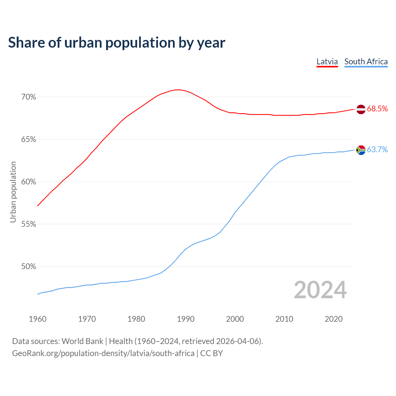 From 2004 to 2024, the share of urban population changed from 67.9% to 68.5% in Latvia and from 59.1% to 63.7% in South Africa.