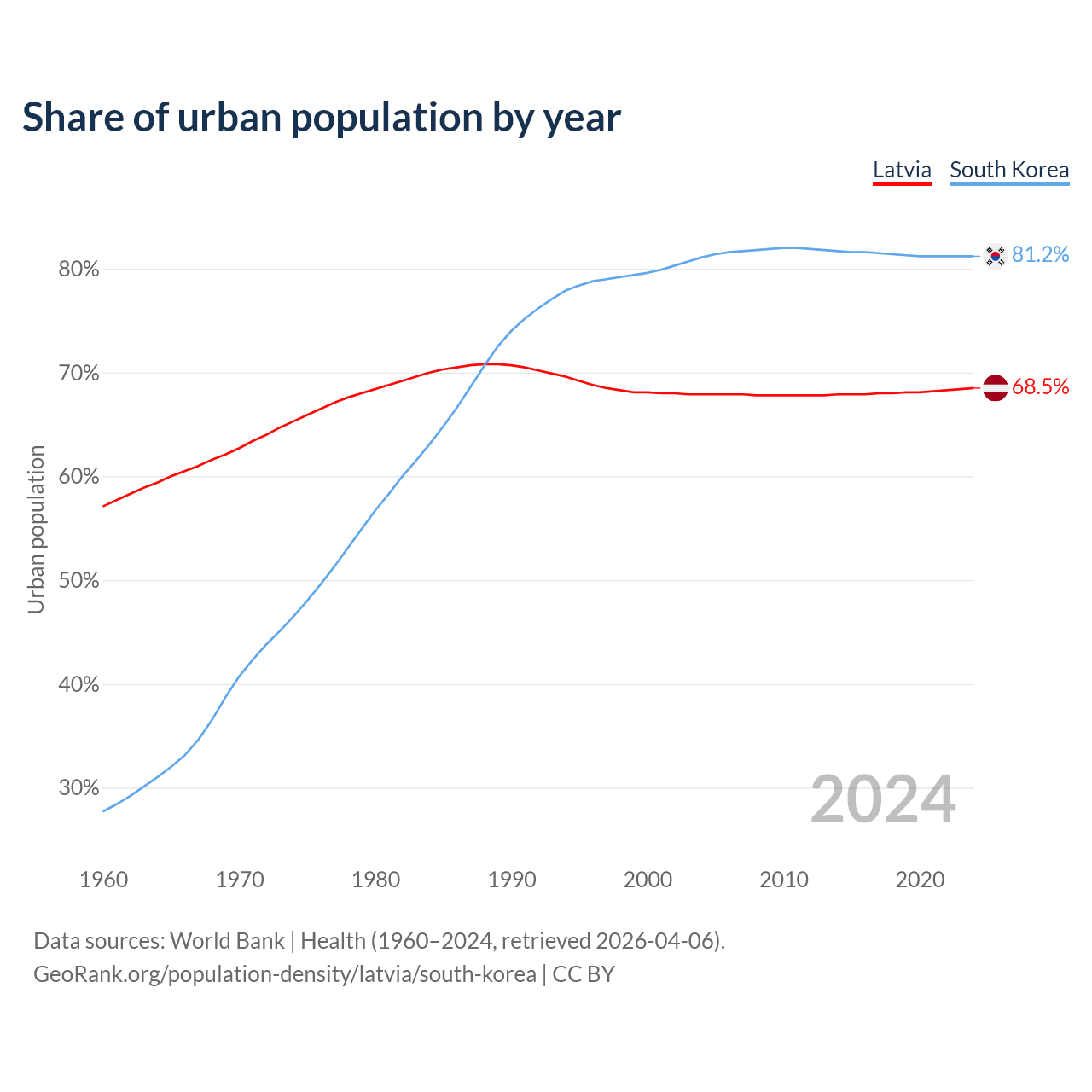From 2004 to 2024, the share of urban population changed from 67.9% to 68.5% in Latvia and from 81.1% to 81.2% in South Korea.