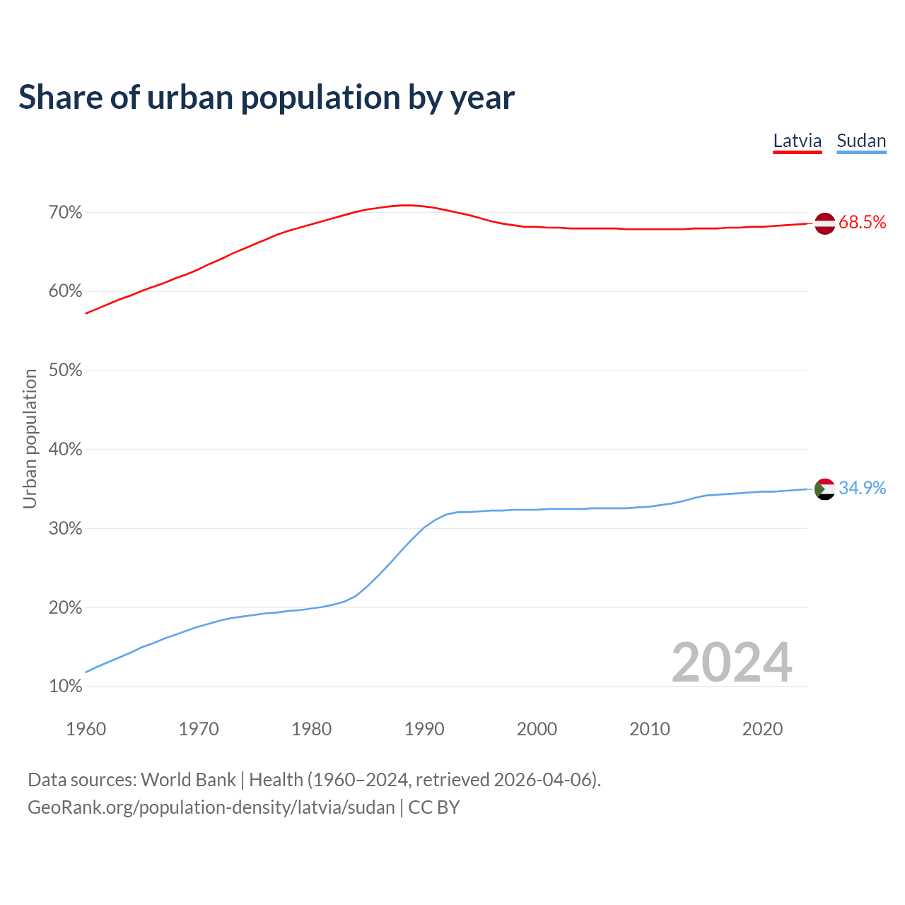 From 2004 to 2024, the share of urban population changed from 67.9% to 68.5% in Latvia and from 32.4% to 34.9% in Sudan.