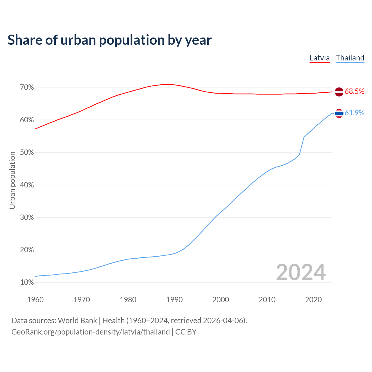 From 2004 to 2024, the share of urban population changed from 67.9% to 68.5% in Latvia and from 36.8% to 61.9% in Thailand.