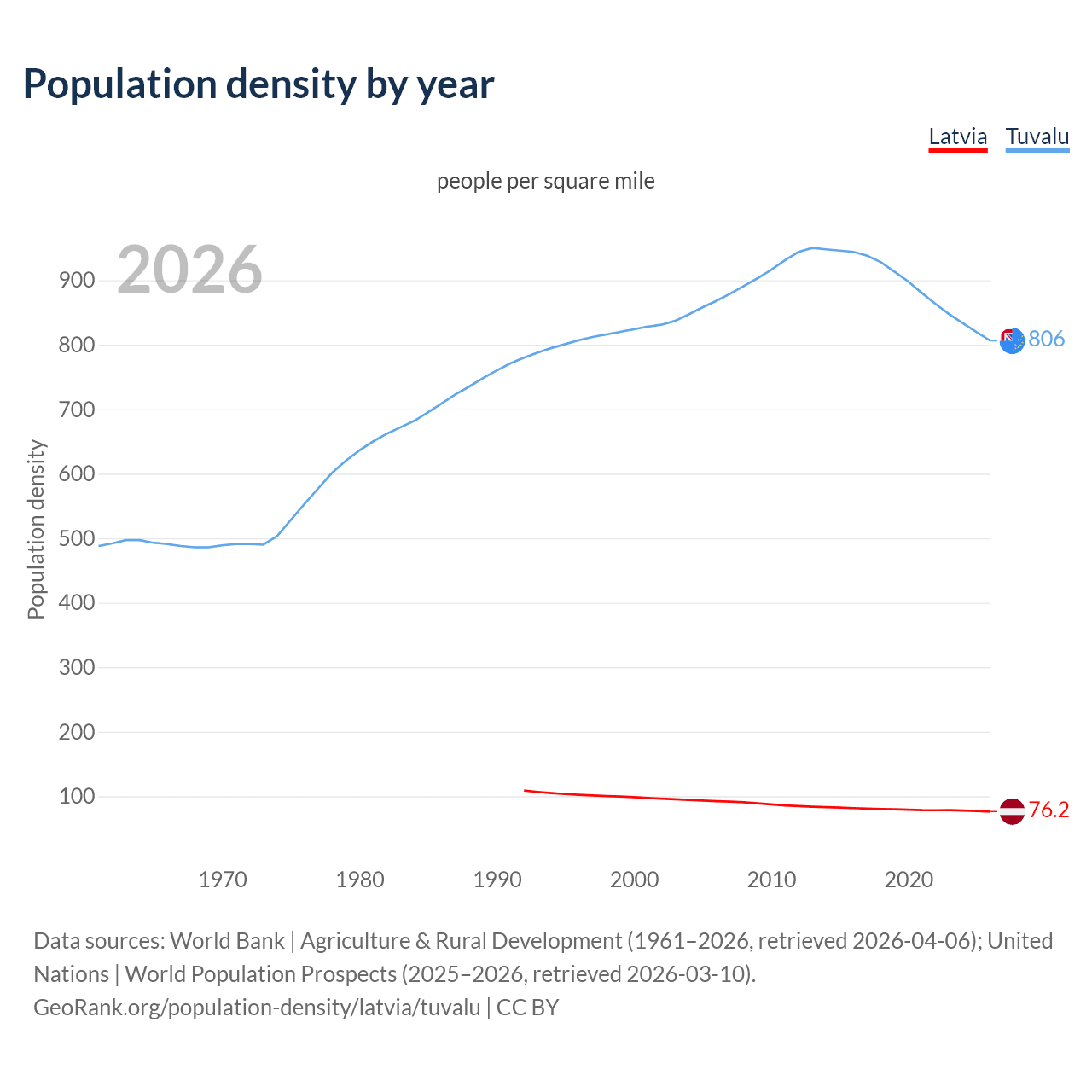 From 2006 to 2026, population density in Latvia decreased by 17.5%, compared to a 7.1% decline in Tuvalu.