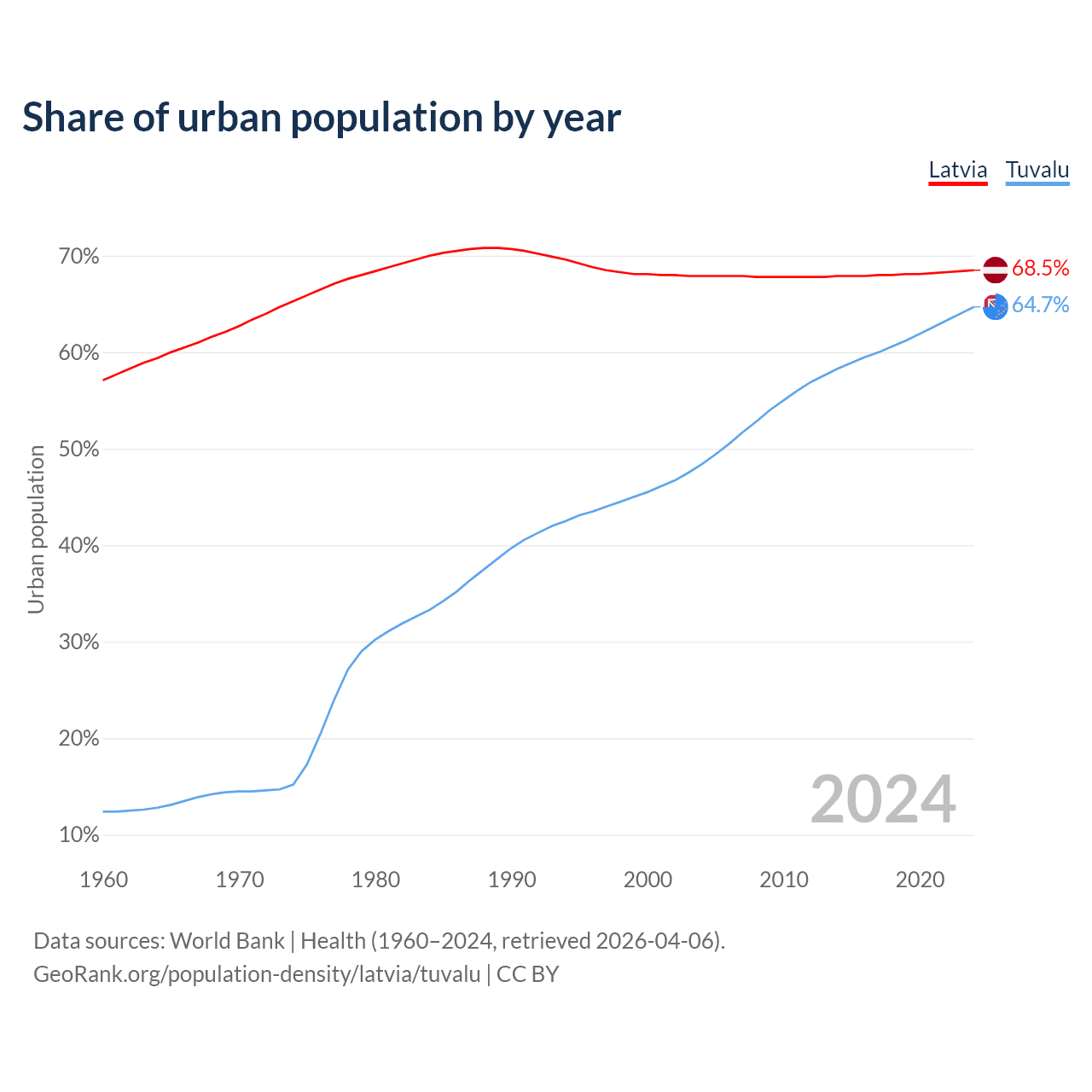 From 2004 to 2024, the share of urban population changed from 67.9% to 68.5% in Latvia and from 48.4% to 64.7% in Tuvalu.