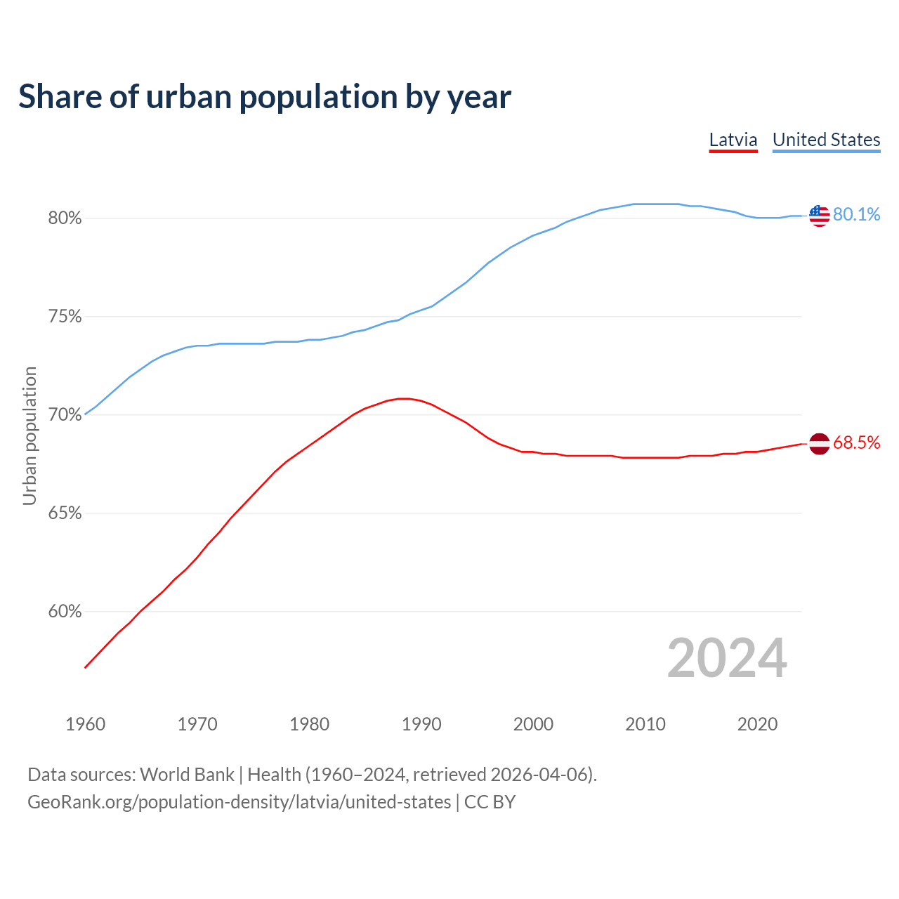 From 2004 to 2024, the share of urban population changed from 67.9% to 68.5% in Latvia and from 80% to 80.1% in the United States.