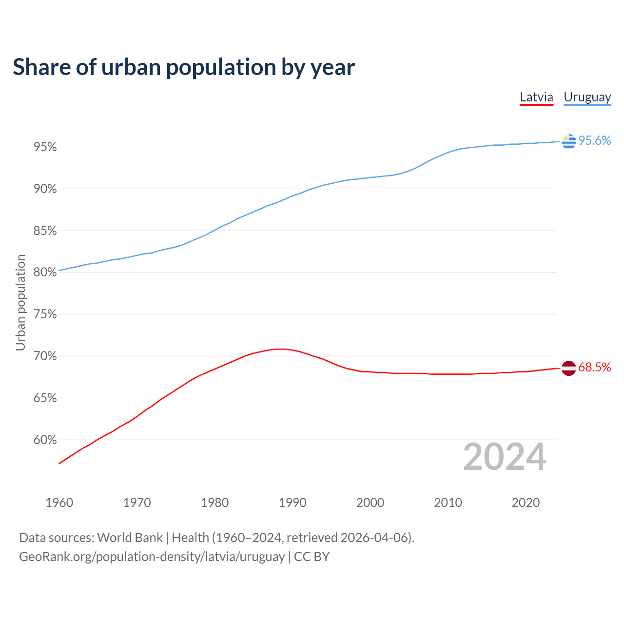 From 2004 to 2024, the share of urban population changed from 67.9% to 68.5% in Latvia and from 91.8% to 95.6% in Uruguay.