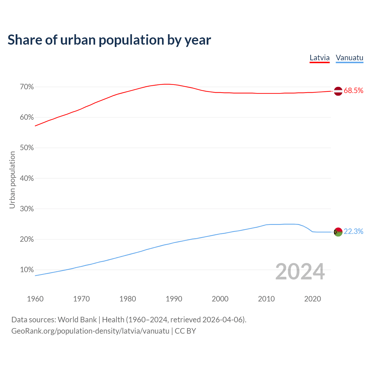From 2004 to 2024, the share of urban population changed from 67.9% to 68.5% in Latvia and from 22.7% to 22.3% in Vanuatu.