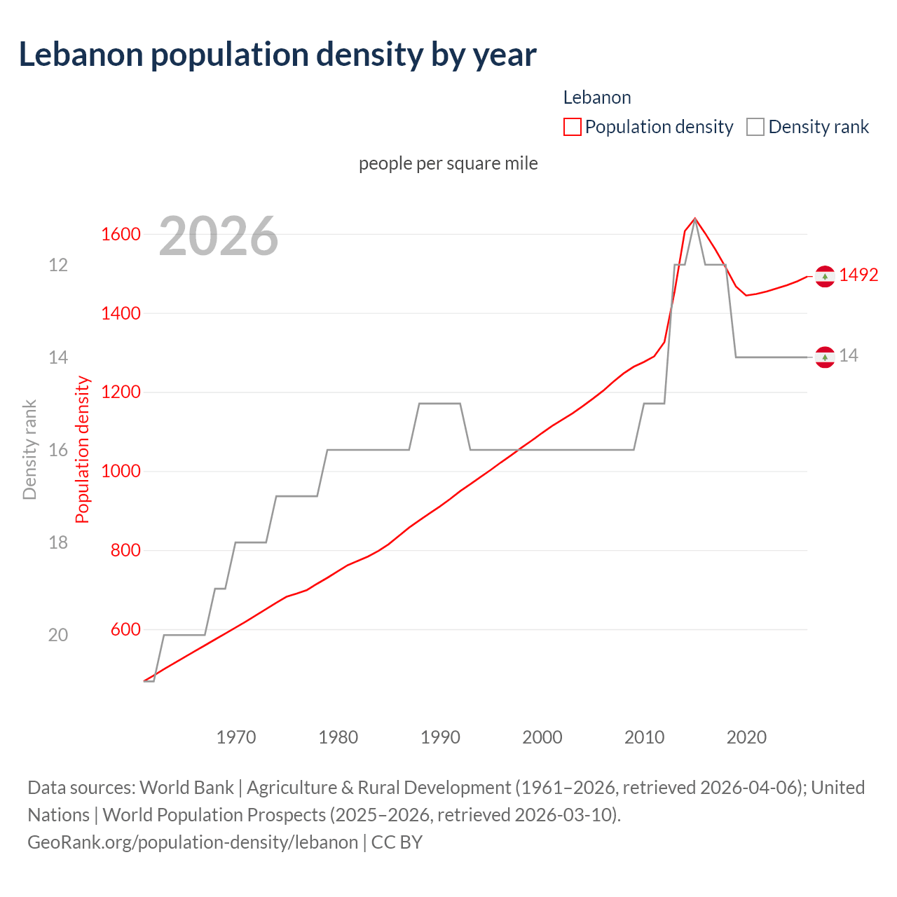 This chart shows how population density in Lebanon has changed over time. From 2006 to 2026, population density increased by 24%. Lebanon ranked 16th by population density 20 years ago and ranks 14th today.