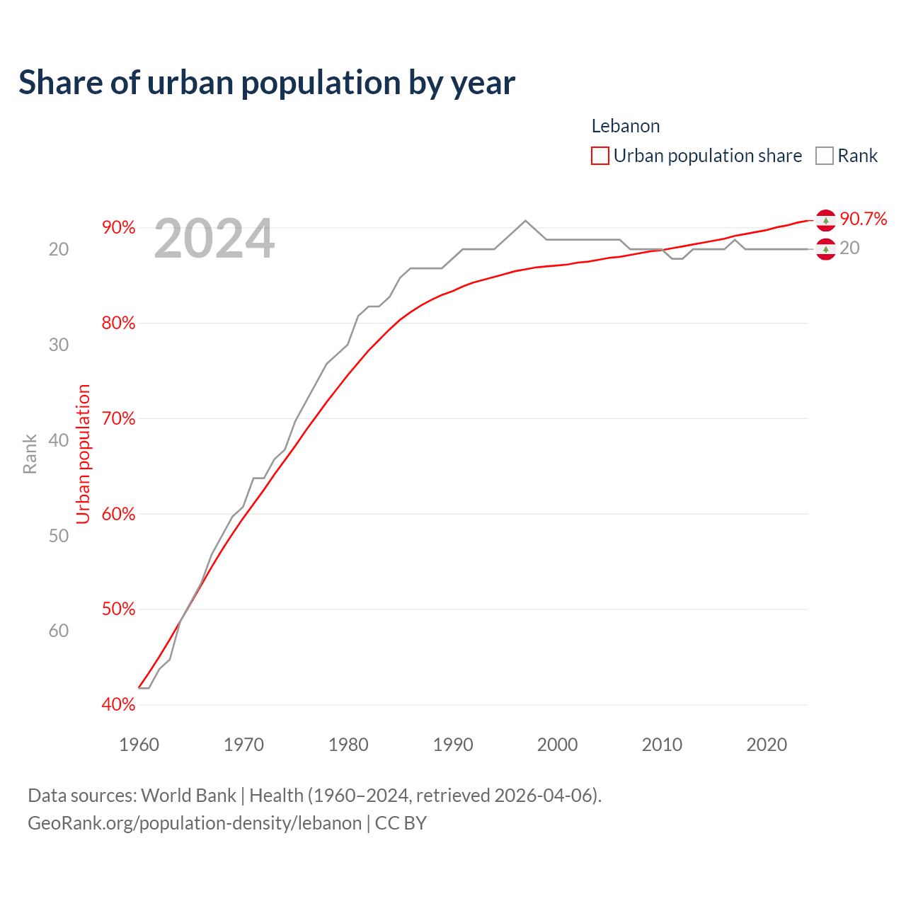 This chart shows the share of urban population in Lebanon from 1960 to 2024: 41.7% lived in urban areas in 1960, 86% in 2000, and 90.7% in 2024.