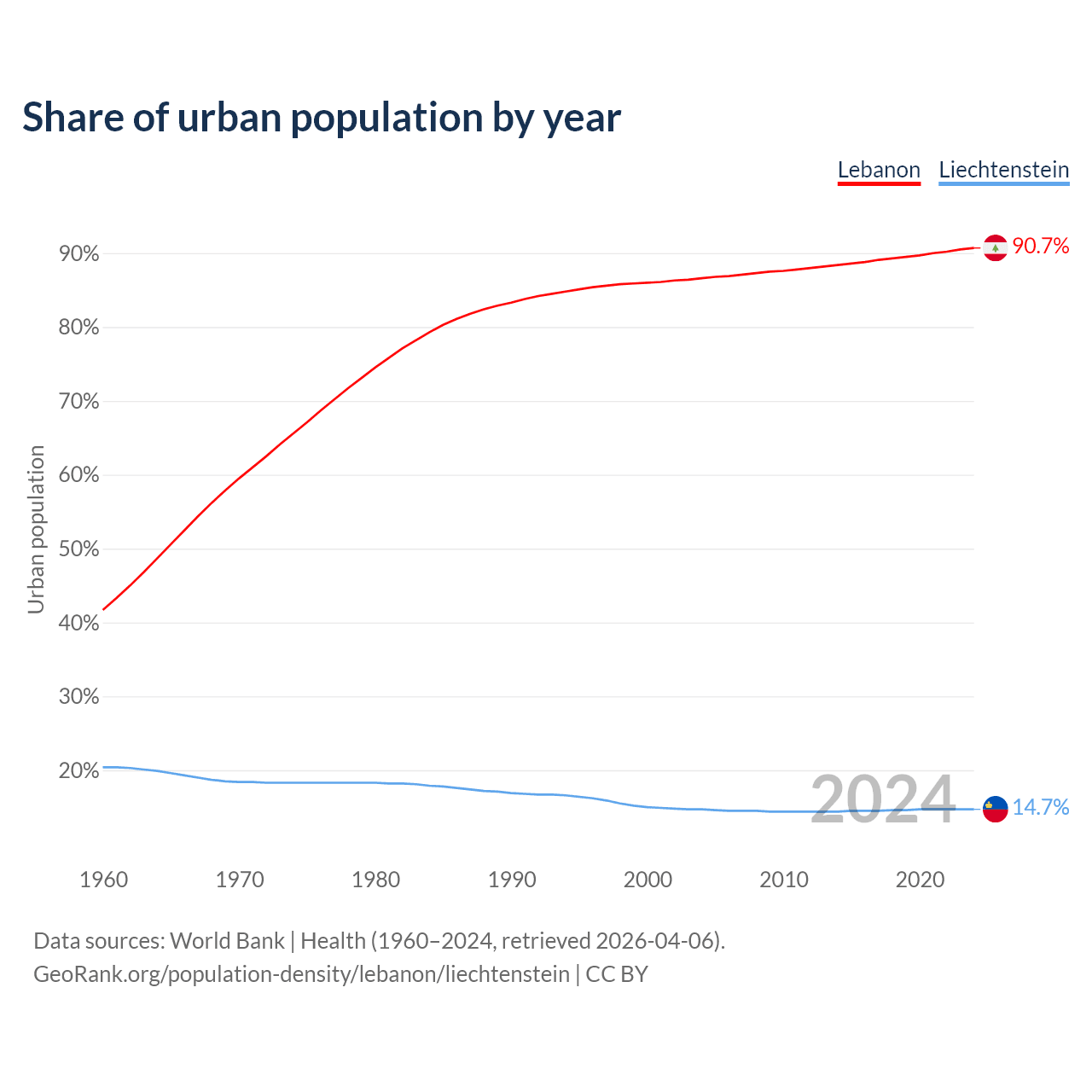 From 2006 to 2026, population density in Lebanon increased by 24%, compared to a 16.9% growth in Liechtenstein.