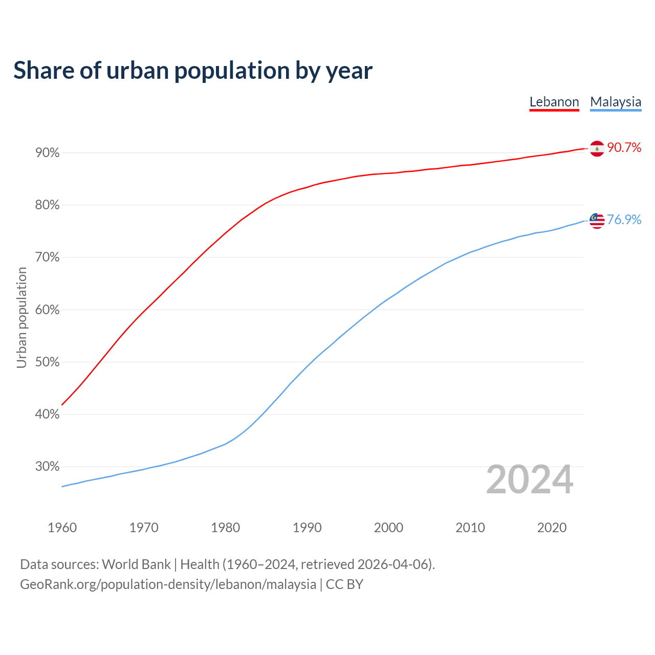 From 2004 to 2024, the share of urban population changed from 86.6% to 90.7% in Lebanon and from 66.1% to 76.9% in Malaysia.