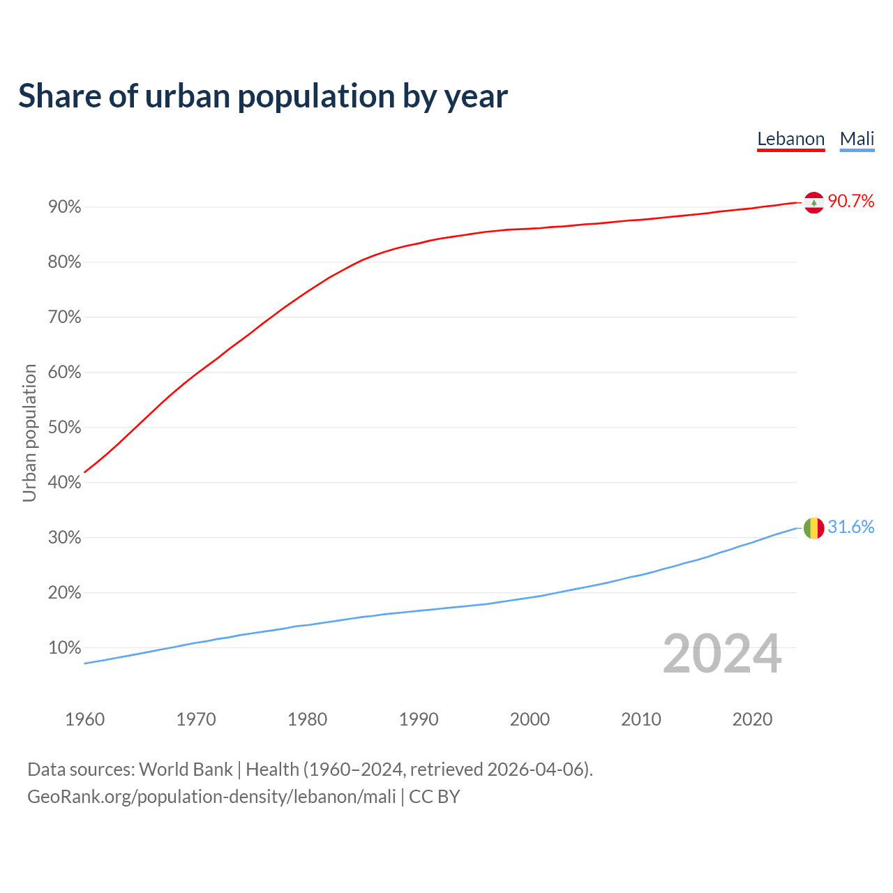 From 2004 to 2024, the share of urban population changed from 86.6% to 90.7% in Lebanon and from 20.5% to 31.6% in Mali.
