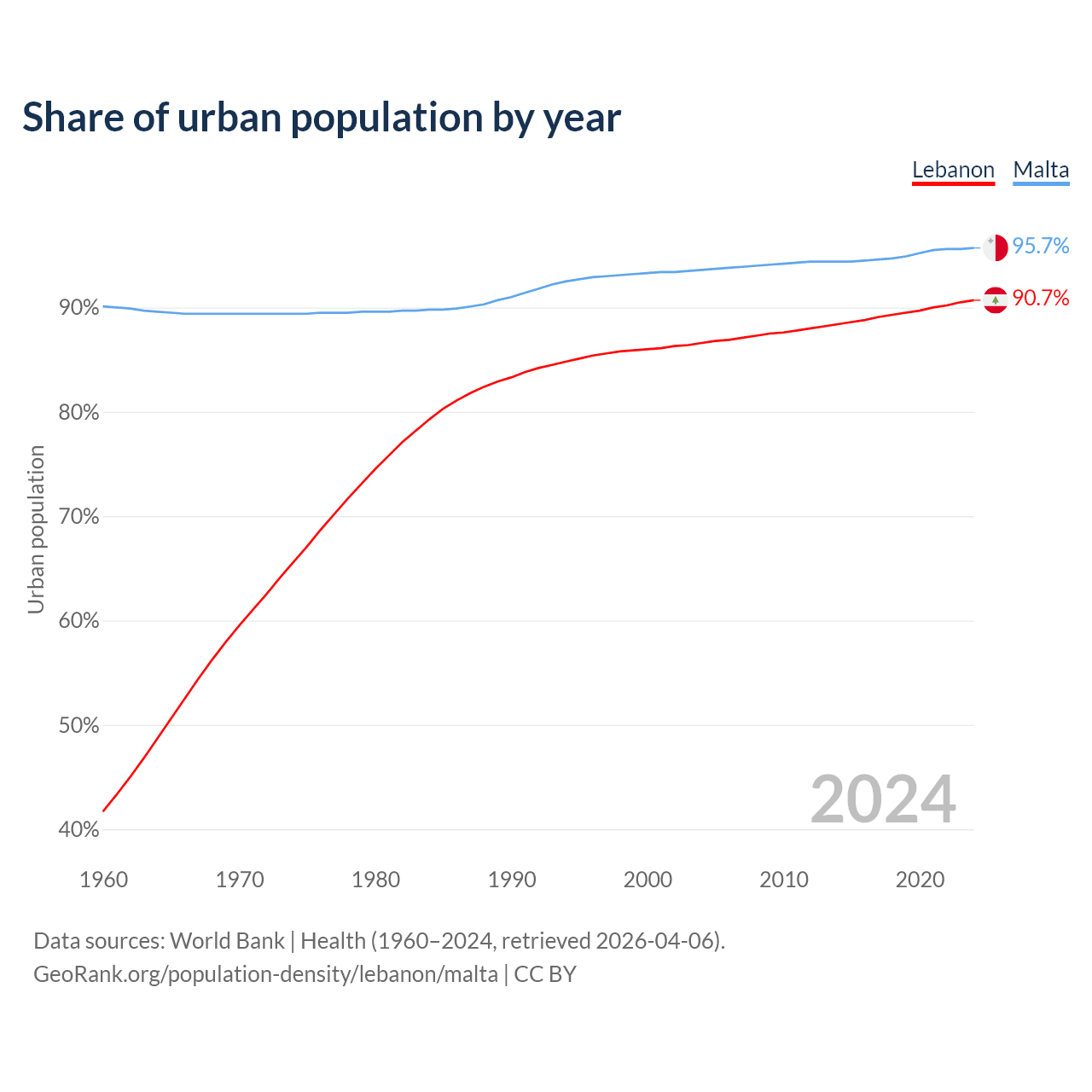 From 2004 to 2024, the share of urban population changed from 86.6% to 90.7% in Lebanon and from 93.6% to 95.7% in Malta.