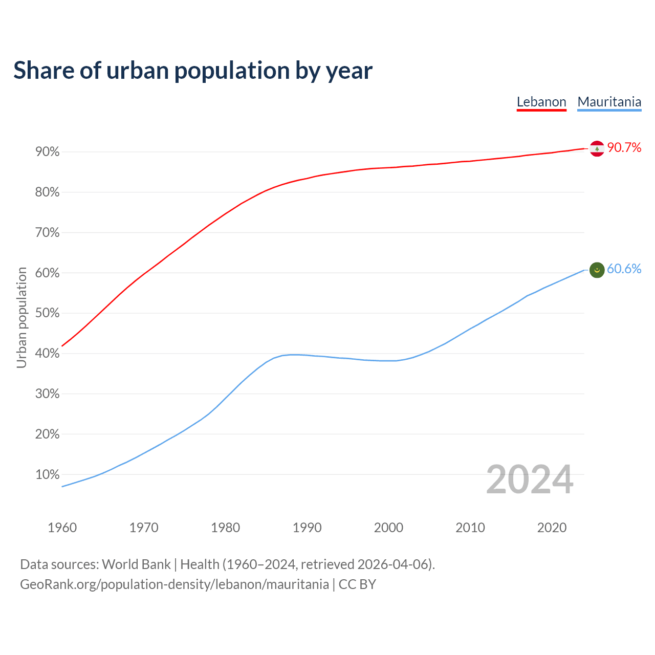 From 2004 to 2024, the share of urban population changed from 86.6% to 90.7% in Lebanon and from 39.6% to 60.6% in Mauritania.