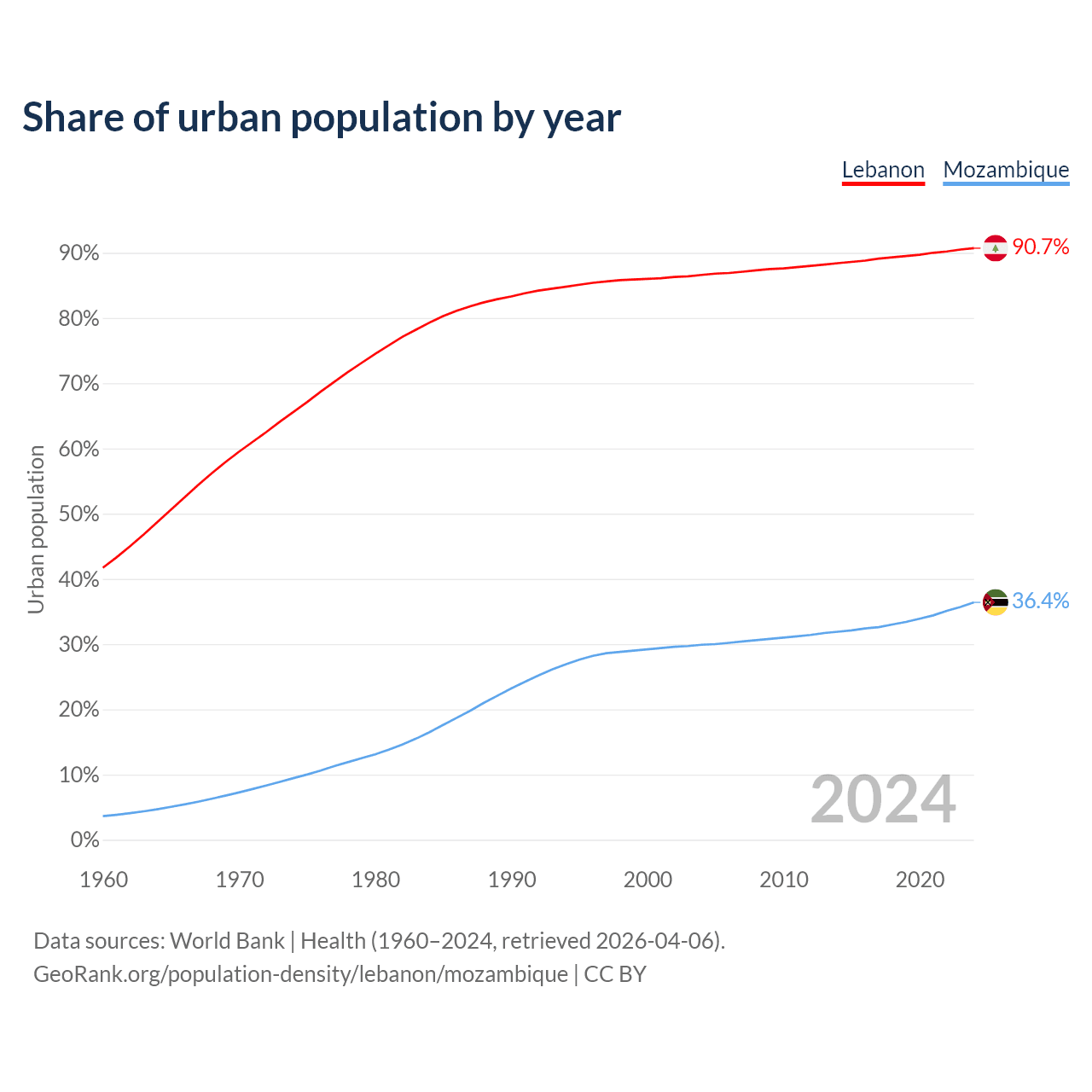 From 2004 to 2024, the share of urban population changed from 86.6% to 90.7% in Lebanon and from 29.9% to 36.4% in Mozambique.