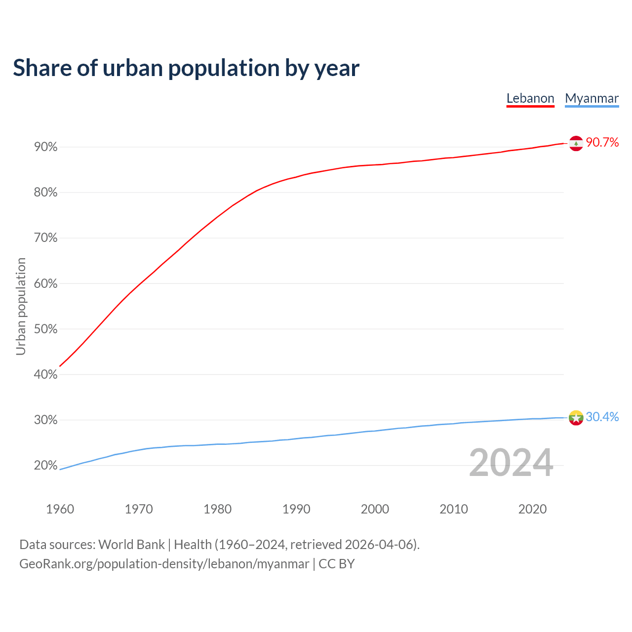 From 2004 to 2024, the share of urban population changed from 86.6% to 90.7% in Lebanon and from 28.2% to 30.4% in Myanmar.