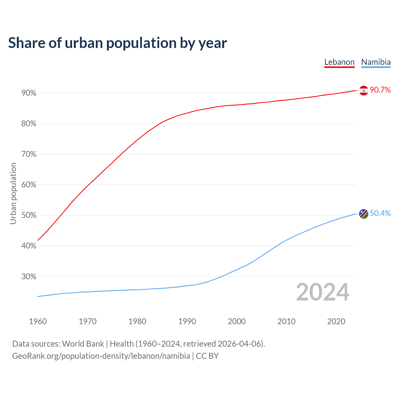 From 2004 to 2024, the share of urban population changed from 86.6% to 90.7% in Lebanon and from 35.5% to 50.4% in Namibia.
