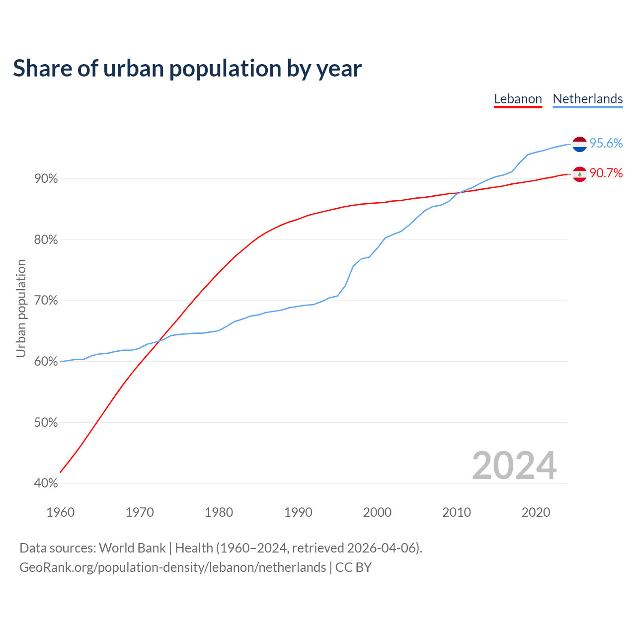 From 2004 to 2024, the share of urban population changed from 86.6% to 90.7% in Lebanon and from 82.3% to 95.6% in the Netherlands.