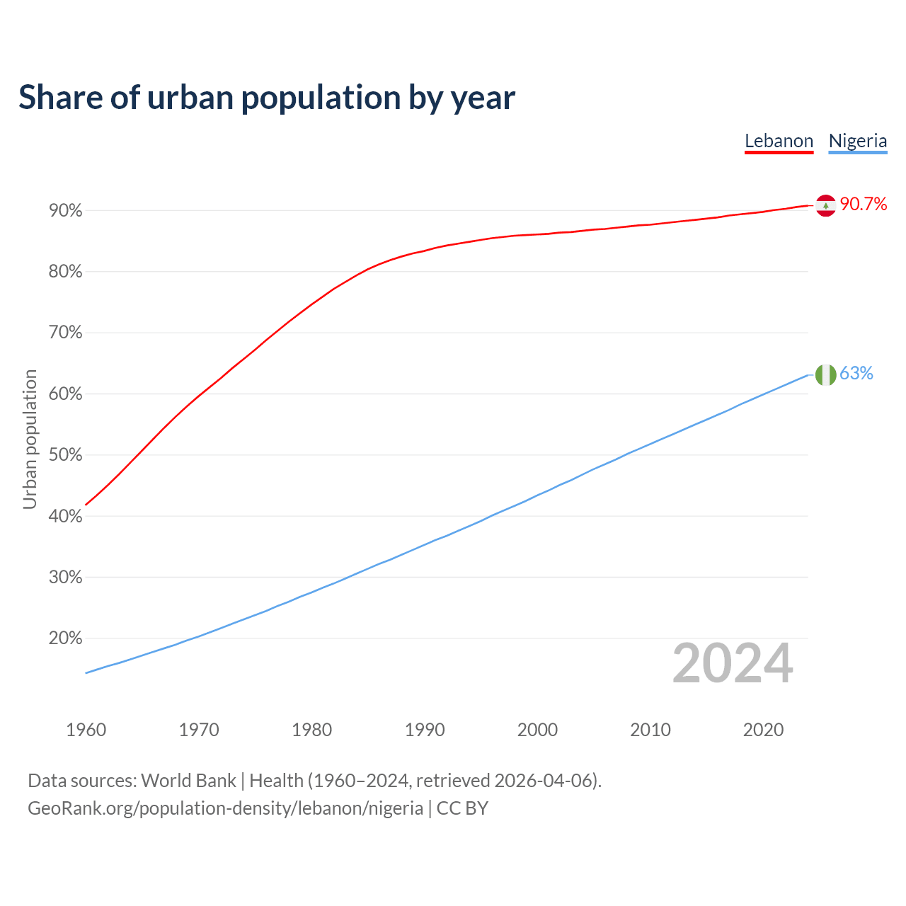 From 2004 to 2024, the share of urban population changed from 86.6% to 90.7% in Lebanon and from 46.7% to 63% in Nigeria.