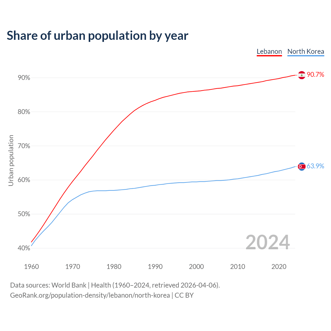 From 2004 to 2024, the share of urban population changed from 86.6% to 90.7% in Lebanon and from 59.7% to 63.9% in North Korea.