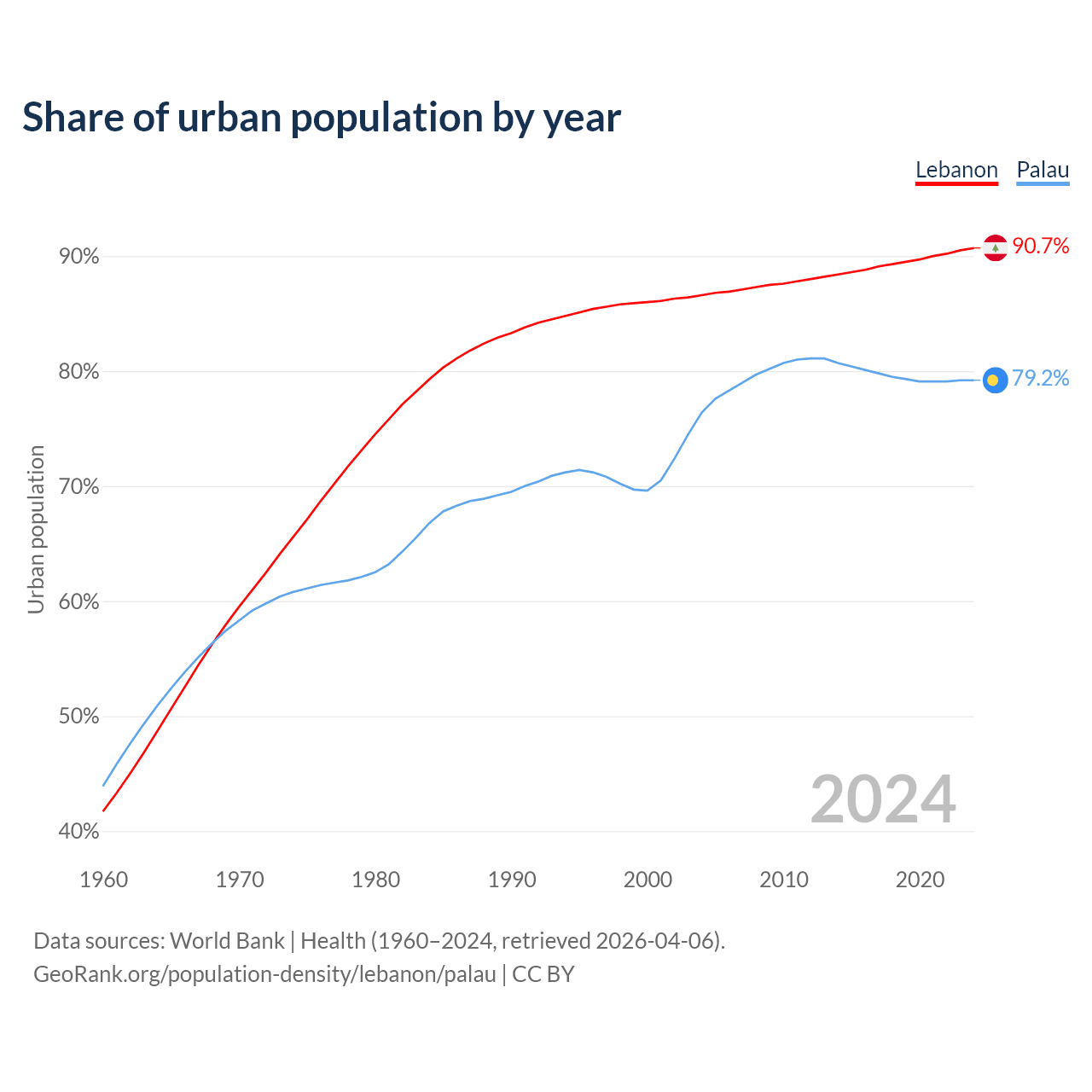 From 2004 to 2024, the share of urban population changed from 86.6% to 90.7% in Lebanon and from 76.4% to 79.2% in Palau.