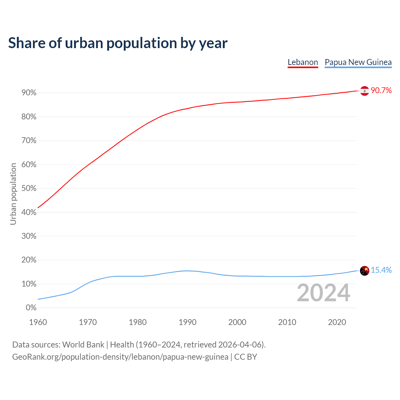 From 2004 to 2024, the share of urban population changed from 86.6% to 90.7% in Lebanon and from 13.1% to 15.4% in Papua New Guinea.