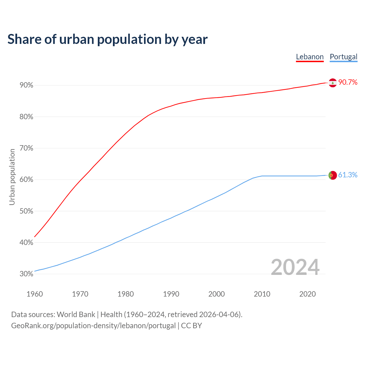 From 2004 to 2024, the share of urban population changed from 86.6% to 90.7% in Lebanon and from 57.4% to 61.3% in Portugal.