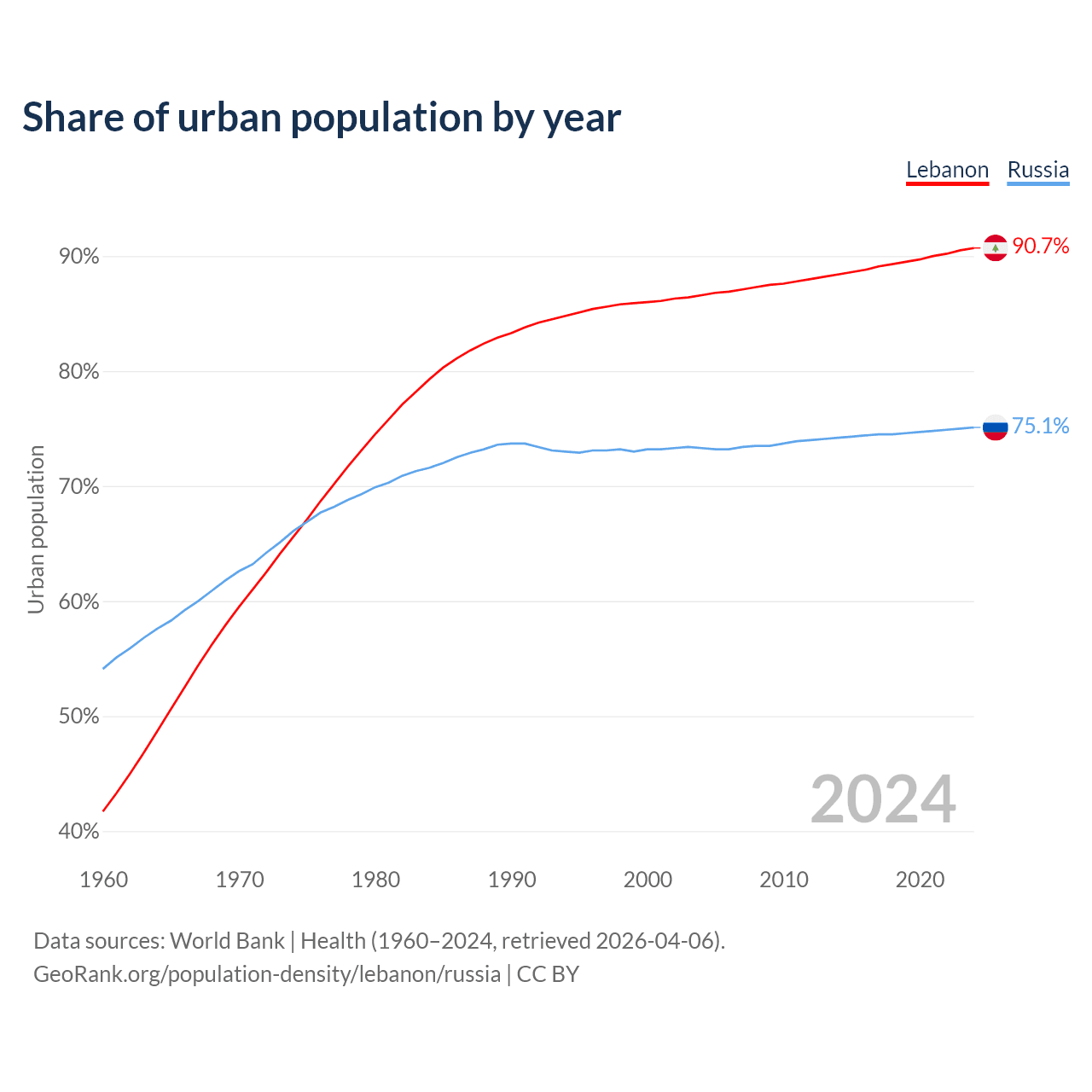 From 2006 to 2026, population density in Lebanon increased by 24%, compared to a 0.79% decline in Russia.