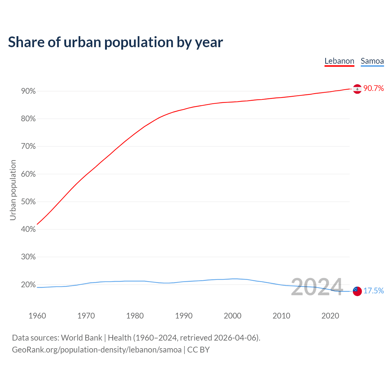 From 2004 to 2024, the share of urban population changed from 86.6% to 90.7% in Lebanon and from 21.5% to 17.5% in Samoa.