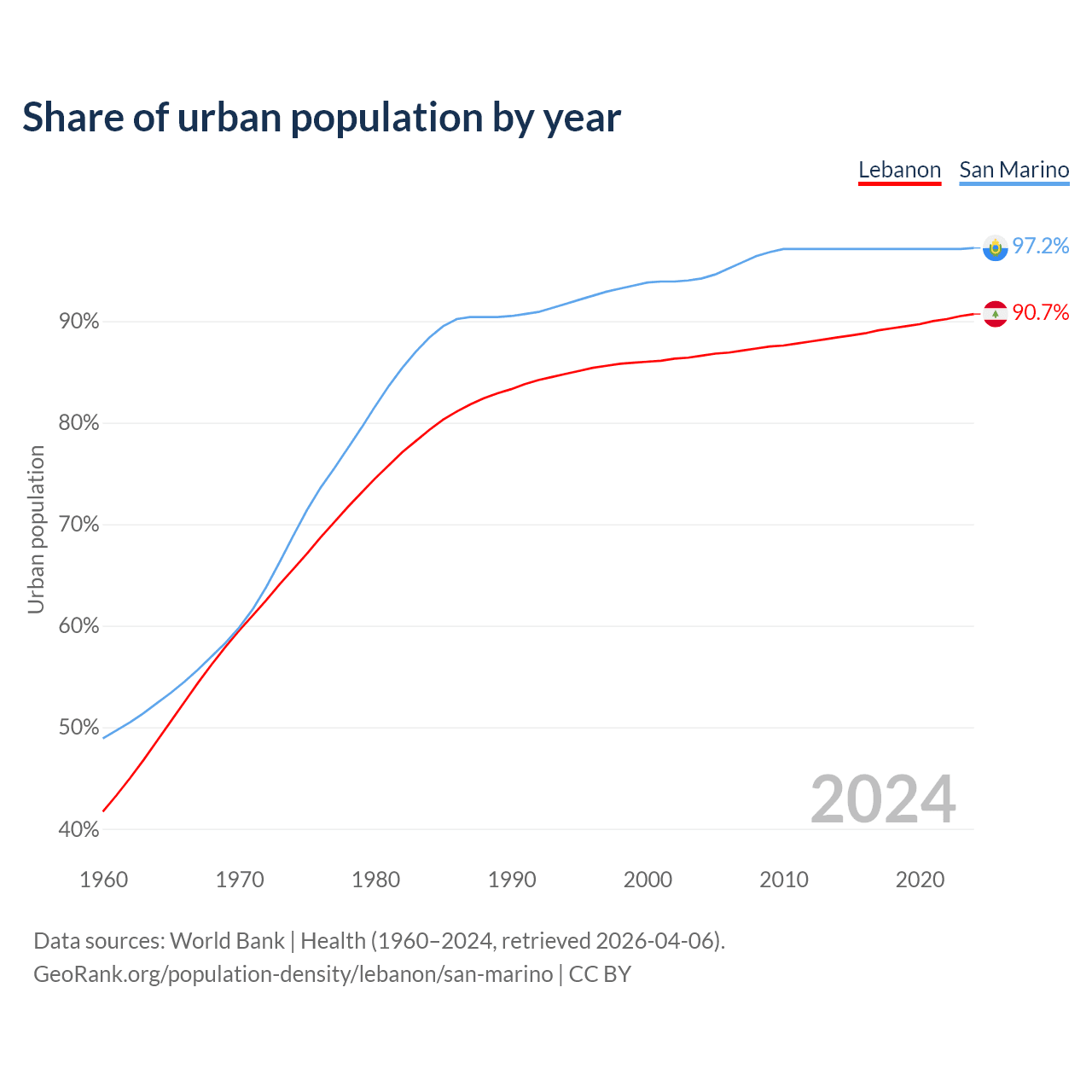 From 2004 to 2024, the share of urban population changed from 86.6% to 90.7% in Lebanon and from 94.2% to 97.2% in San Marino.