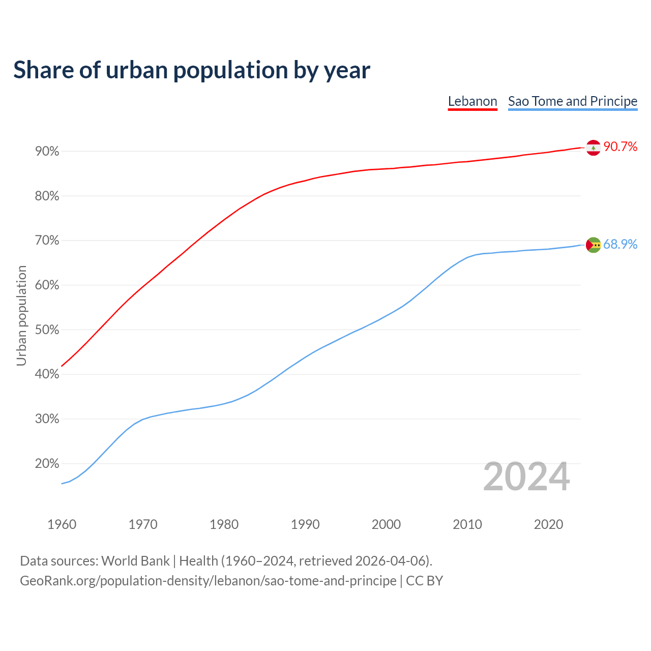 From 2004 to 2024, the share of urban population changed from 86.6% to 90.7% in Lebanon and from 57.9% to 68.9% in Sao Tome and Principe.