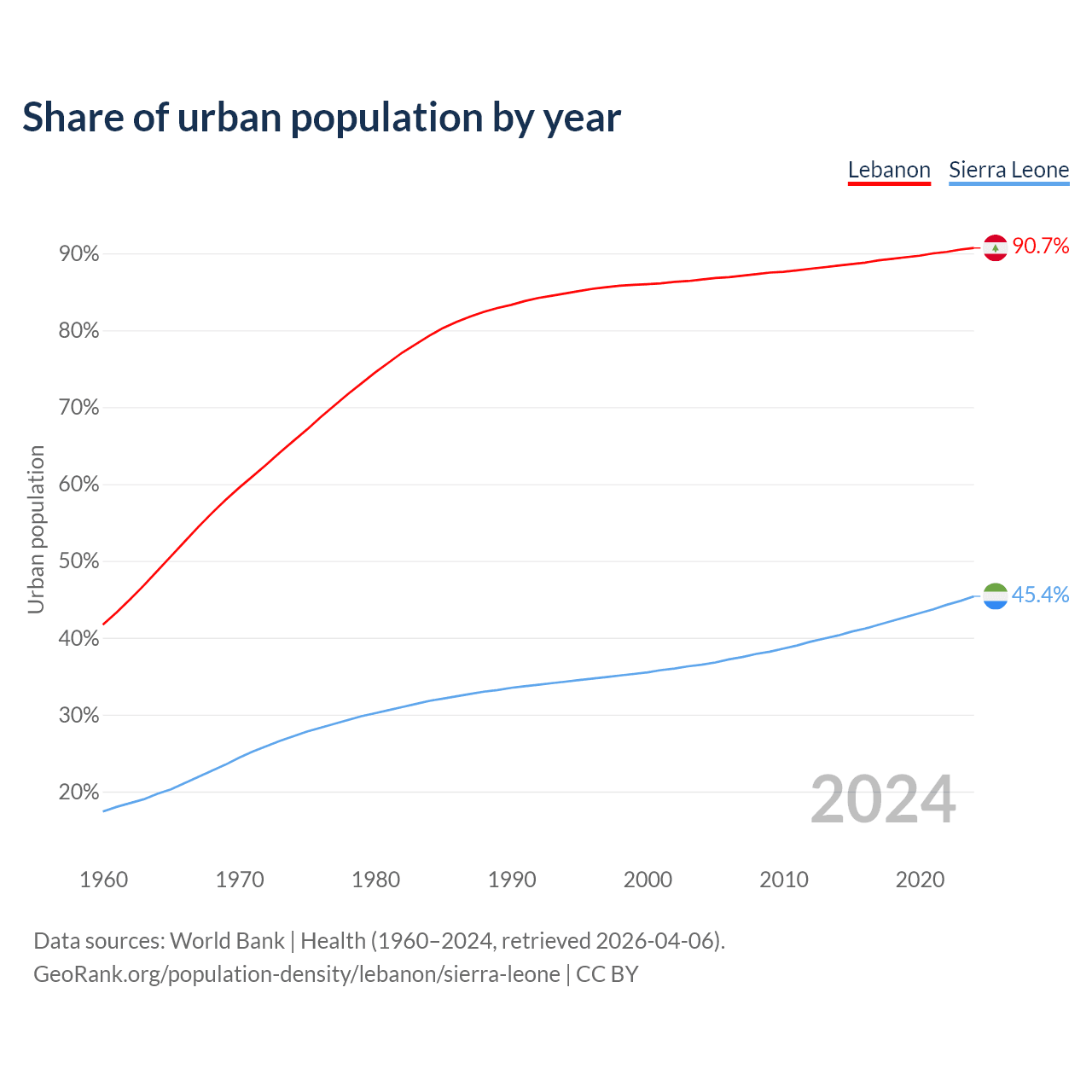 From 2004 to 2024, the share of urban population changed from 86.6% to 90.7% in Lebanon and from 36.5% to 45.4% in Sierra Leone.