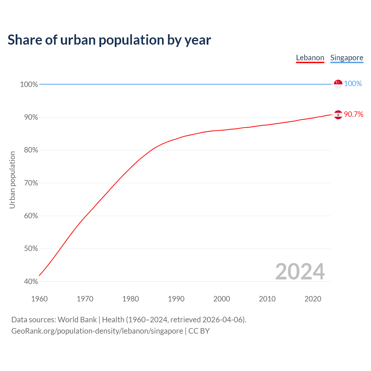 From 2004 to 2024, the share of urban population changed from 86.6% to 90.7% in Lebanon and from 100% to 100% in Singapore.