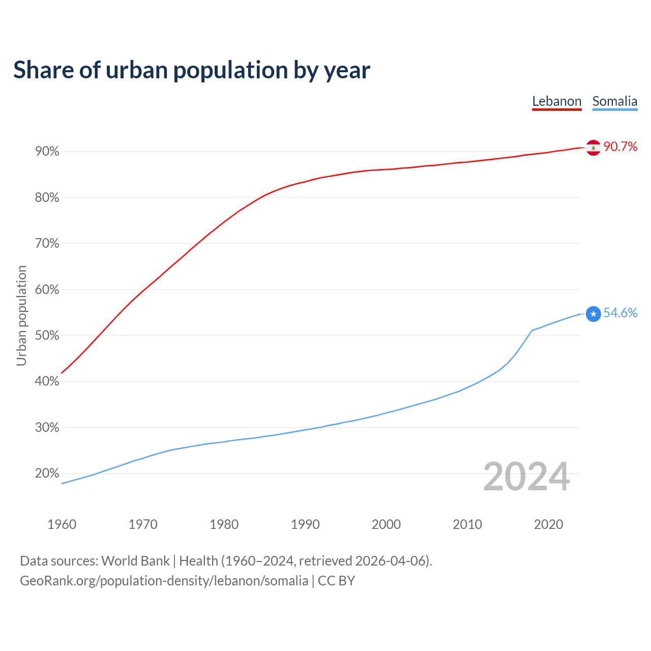 From 2004 to 2024, the share of urban population changed from 86.6% to 90.7% in Lebanon and from 35% to 54.6% in Somalia.