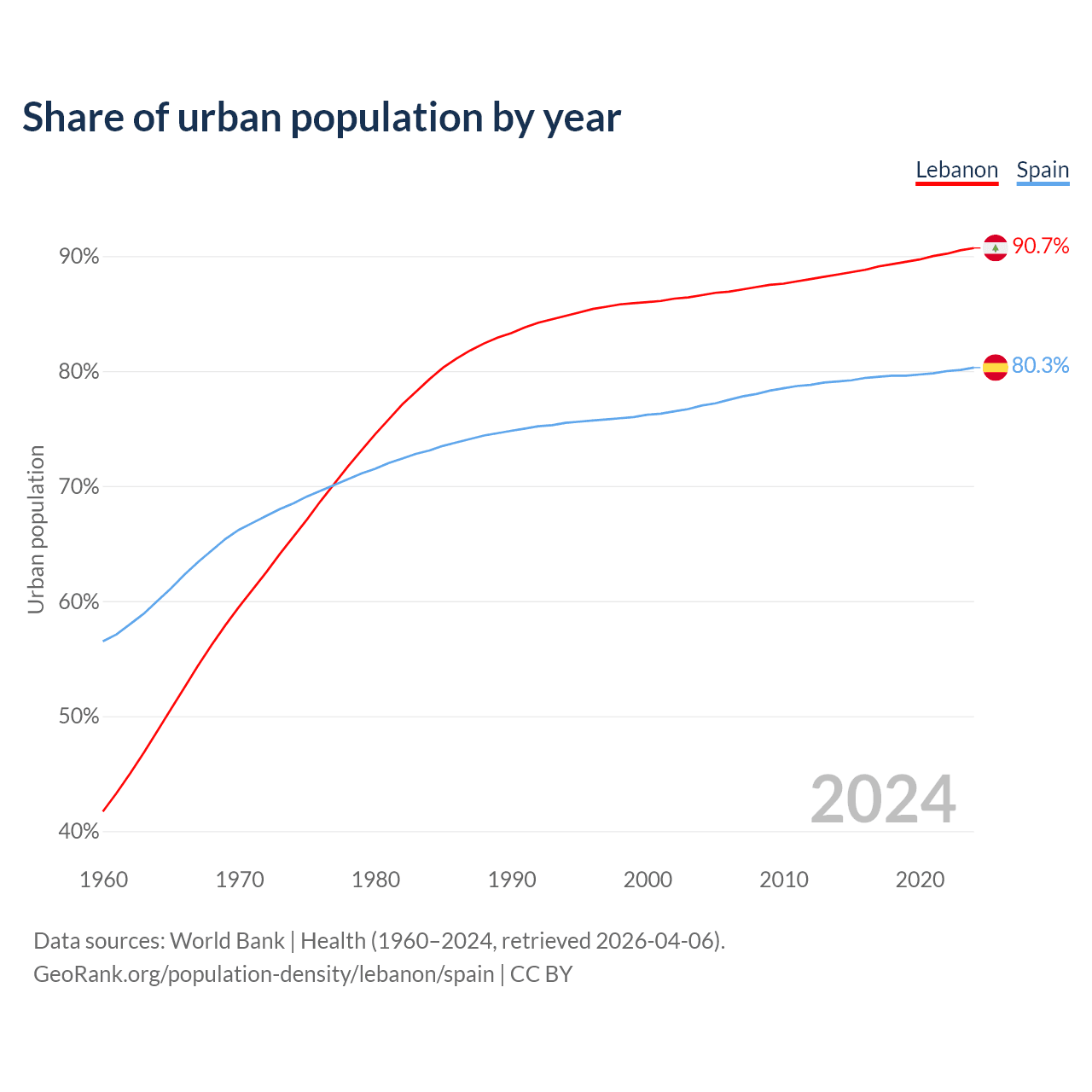 From 2004 to 2024, the share of urban population changed from 86.6% to 90.7% in Lebanon and from 77% to 80.3% in Spain.