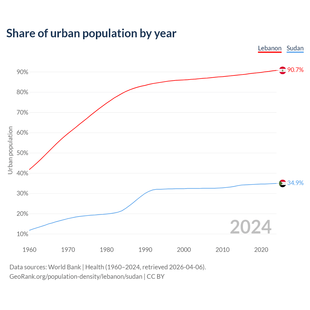 From 2004 to 2024, the share of urban population changed from 86.6% to 90.7% in Lebanon and from 32.4% to 34.9% in Sudan.
