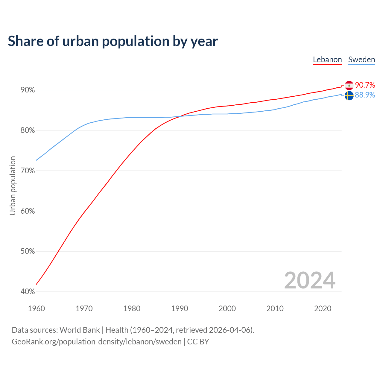 From 2004 to 2024, the share of urban population changed from 86.6% to 90.7% in Lebanon and from 84.3% to 88.9% in Sweden.